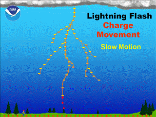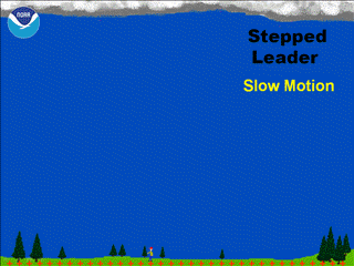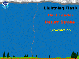 Each cloud-to-ground lightning flash consists of one or more leaders followed by one or more return strokes. The leader is the initial step in the lightning flash and establishes the conductive channel that the electrical discharge (lightning) will take. There are different types of leaders. The most common type of leader is the negative stepped leader. Once a charged leader makes a connection with the ground, the return stroke occurs. The return stroke is simply the rapid discharge of electricity that has accumulated on the leader. We see this discharge as the bright flash of lightning.