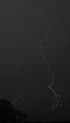 The next two videos show another example of a stepped leader. Unlike the previous example, this video shows just two main channels approaching ground. This video is less exposed than the previous example (which makes everything appear dimmer). In this case, the tips of the stepped leaders are racing toward the ground. The first to make a connection discharges the entire channel. Note that the actual time between the appearance of the stepped leader to the return stroke is about 1/50 of a second.